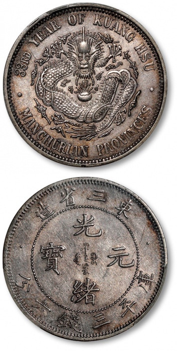 清光绪33年东三省造光绪元宝库平七钱二分银币一枚,图案整体清晰,龙图饱满,原味醇厚灰色老包浆,状态自然舒服,少见之名誉品,有分数者十分难得,金盾PCGS XF45(41519199),此分数仅七枚,更高分仅七枚 ...