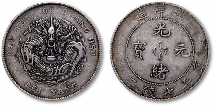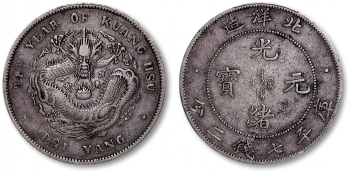 清光绪34年北洋造光绪元宝库平七钱二分银币一枚,整体清晰,灰色老包浆,状态自然,金盾PCGS VF35(88101959)