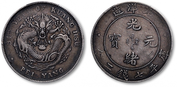 清光绪34年北洋造光绪元宝库平七钱二分银币一枚,整体清晰,灰色老包浆,状态自然,金盾PCGS VF35(88102130)