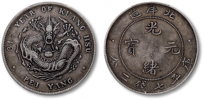 清光绪34年北洋造光绪元宝库平七钱二分银币一枚,整体清晰,灰色老包浆,状态自然,金盾PCGS VF35(88102370)