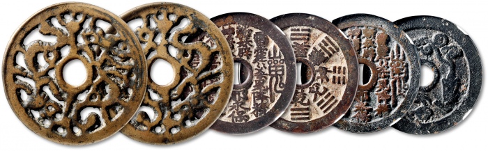 早期“双龙”镂空花钱一枚、“山鬼雷公”背“八卦”花钱一枚、“山鬼雷公”背“道士图”花钱一枚,共计三枚,直径分别为:45mm、45.4mm、54.5mm,分别为公博 美75、美78(1114951939、1114951952、1114951964) ...