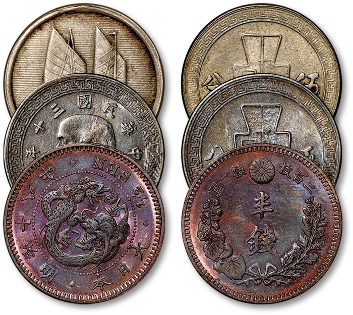 机制币共三枚不同,详分:帆船背布图伍分镍币一枚;民国三十年孙中山像背布图五分镍币一枚;日本明治十八年半钱铜元一枚;打制规范,图案清晰,包浆醇厚,光泽柔亮,极美至完全未使用品 ...