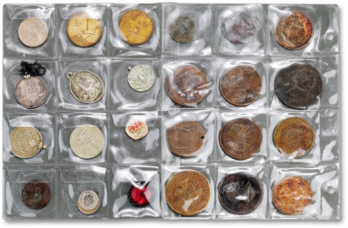 利用通宝三枚,至正通宝,永历通宝,光天元宝,开元通宝错版等各一枚)