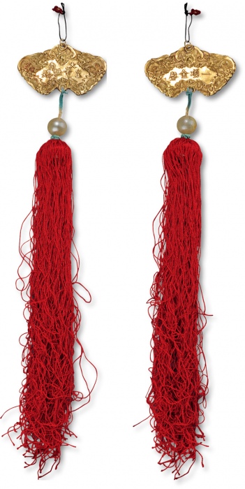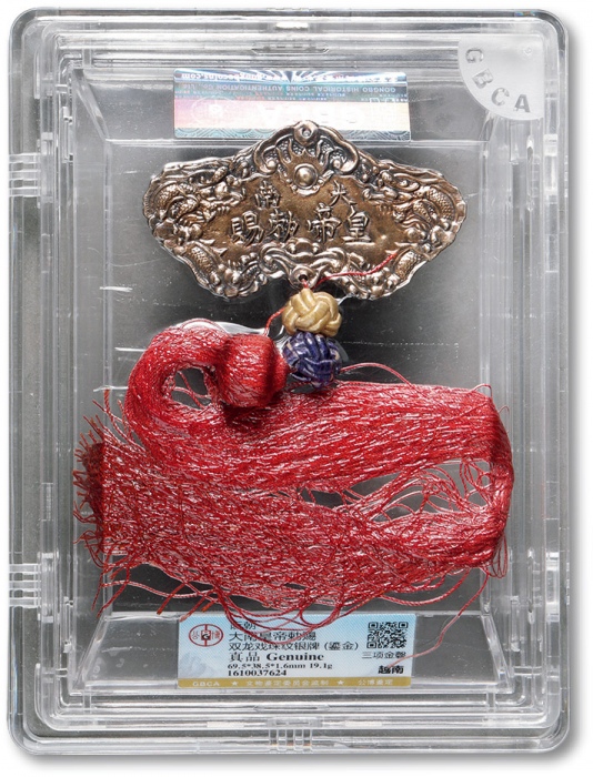 安南金佩“琼瑶永好”背“启定年造”牌饰一枚,重:17g,纯手工制作,四周以双凤、天书及火珠图案装饰,其中,启定年号使用为1916年至1925年。佩,于1889年开始颁发,专门用以奖赏具有高尚美德的女性,作为安南阮朝时期皇家赏赐之物非常罕见,北京珠博 美82(00027966)