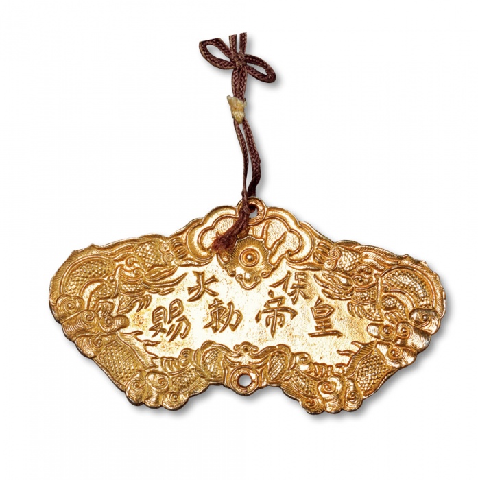 安南金佩“琼瑶永好”背“启定年造”牌饰一枚,重:17g,纯手工制作,四周以双凤、天书及火珠图案装饰,其中,启定年号使用为1916年至1925年。佩,于1889年开始颁发,专门用以奖赏具有高尚美德的女性