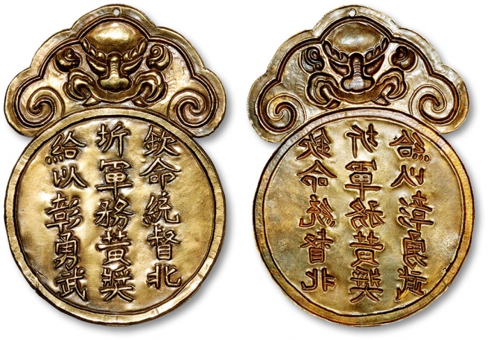 安南“钦命统督北圻军务黄奖给·以彰勇武”金奖章一枚,重:7.9g,打制精美,狮头威武,保存完好,近未使用品