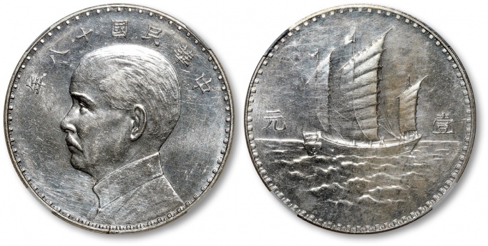 民国十八年孙中山像背三帆船壹元银币样币一枚,奥地利版,杭州造币厂试铸,未发行,此币铸模深峻,人物清晰精美,镜面版底,银光洁白,状态上佳,CNCS SP61(100000333)