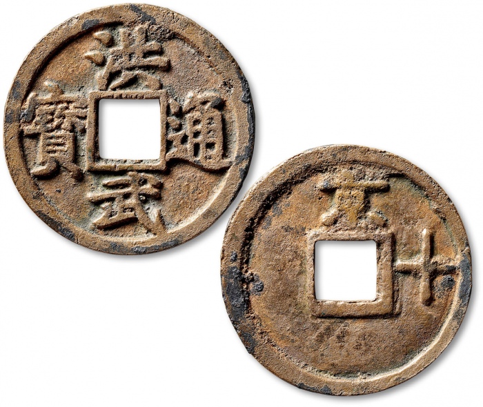 “洪武通宝”背“济”折五一枚,直径:40.3mm,铸造规范,文字清晰,色泽斑斓,品相极佳,洪武钱大名誉品,极为难得罕贵,极美品