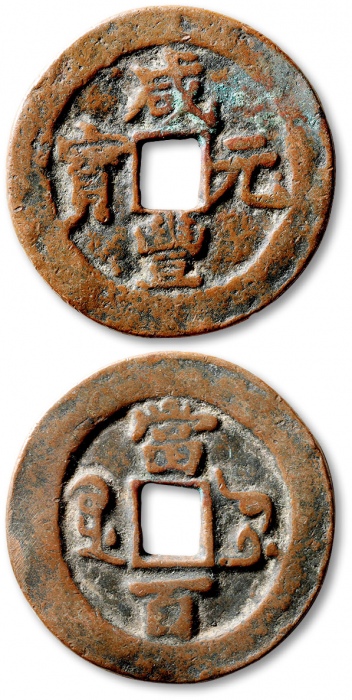 清“咸丰元宝”阿克苏局当百一枚,直径:41.3mm,钱体圆整,字口挺拔清晰,包浆醇熟,海外回流,极美品