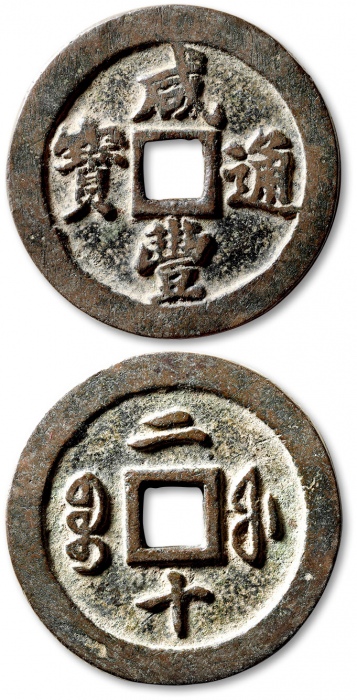清“咸丰通宝”宝福局二十一枚,直径:46.4mm,钱体圆整,字口挺拔清晰,包浆熟美,海外回流,极美品