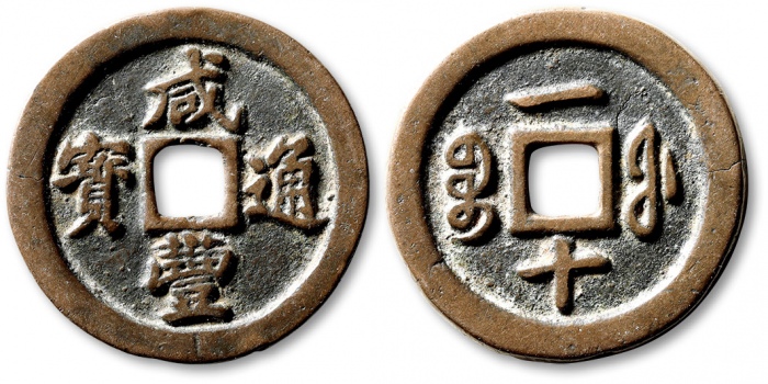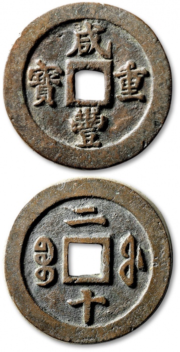 清“咸丰重宝”宝福局二十外计重一两一枚,直径:47.8mm,钱体圆整,字口挺拔清晰,包浆熟美,海外回流,有铸缺,极美品