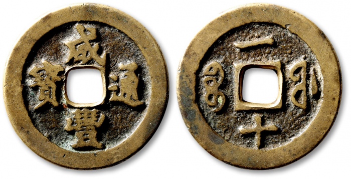 清“咸丰通宝”宝福局一十试铸样钱一枚,直径:37.6mm,钱体圆整,铜色黄亮,字口清晰,包浆熟美,海外回流,极美品
