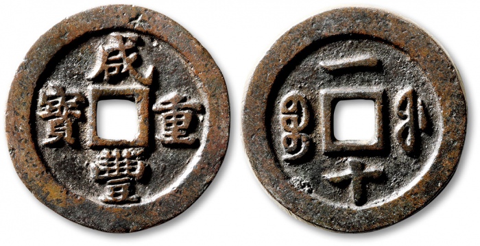 清“咸丰重宝”宝福局一十外计重五钱一枚,直径:37.3mm,钱体圆整,字口挺拔清晰,包浆熟美,海外回流,极美品