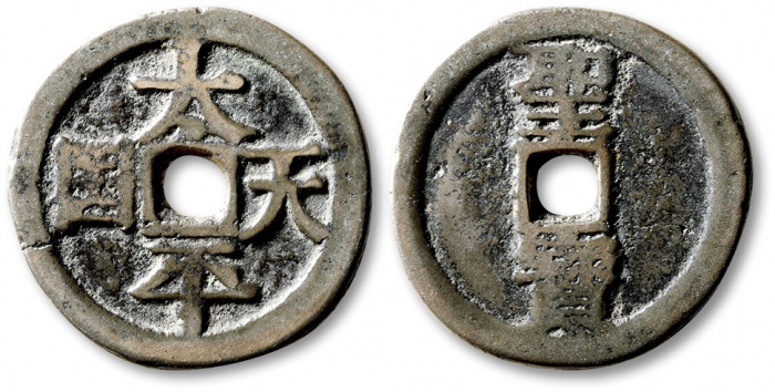清“太平圣宝”背“天国”一枚,直径:26.1mm,钱体圆整,字口立体清晰,包浆熟美,海外回流,极美品