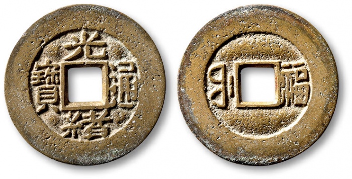 清“光绪通宝”背满汉“福”川炉套子钱一枚,水波版,直径:24.8mm,钱体圆整,字口立体清晰,包浆熟美,海外回流,极美品
