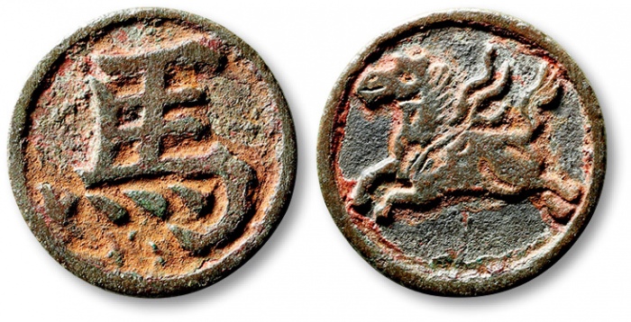 早期“马”铜棋子一枚,直径:24.5mm,文字工整挺拔,图案清晰,包浆厚重,极美品