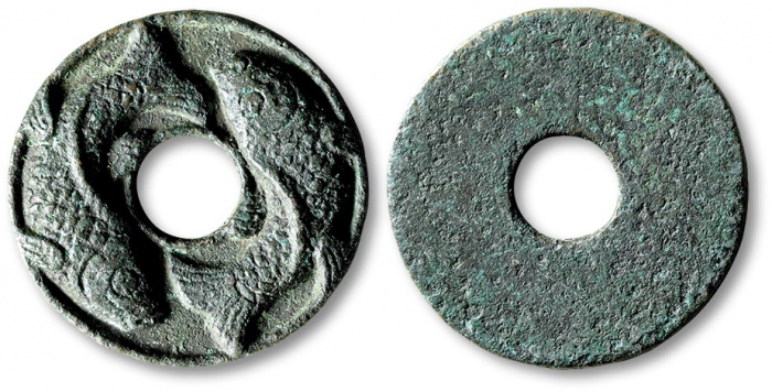 早期“双鱼”浮雕花钱一枚,少见,直径:31.5mm,钱体圆整,图案极为清晰,包浆厚重,极美品