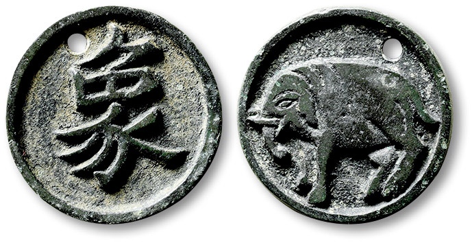 早期“象”铜棋子一枚,直径:23mm,文字工整挺拔,图案清晰,包浆厚重,极美品