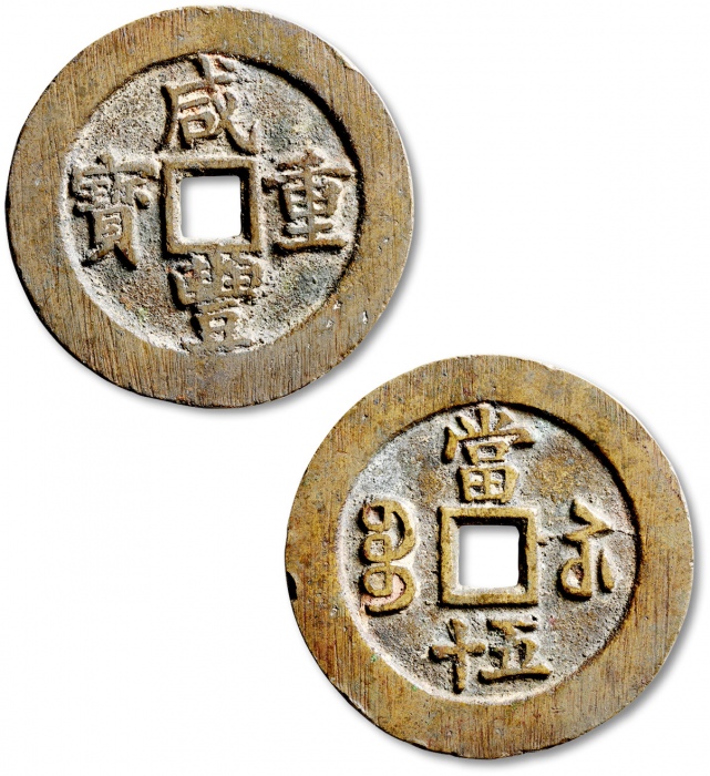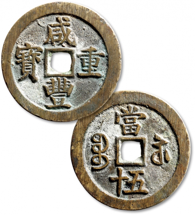 清“咸丰重宝”宝苏局当十、当五十共计二枚,直径分别为:40.5mm、53.5mm,文字清晰,包浆厚重,上美品