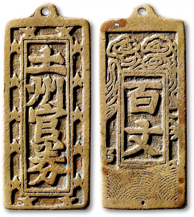 清“土州官券”百文一枚,高:59.1mm,铜色黄亮,钱文挺拔饱满,包浆熟美,十分清晰,著名前辈藏家孙仲汇先生题拓,极美品