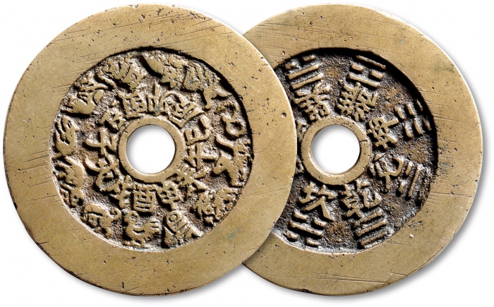清“十二生肖”背“八卦”宽缘花钱一枚,直径:52mm,文字清晰,铜质精良,包浆温润自然,极美品