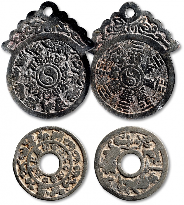 清“十二生肖”背“八卦”挂花一枚,高:56.1mm,华夏 极美80(6262832705);“十二生肖”背“敕令人物”铅质花钱一枚,直径:35.5mm,上美品