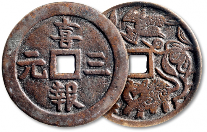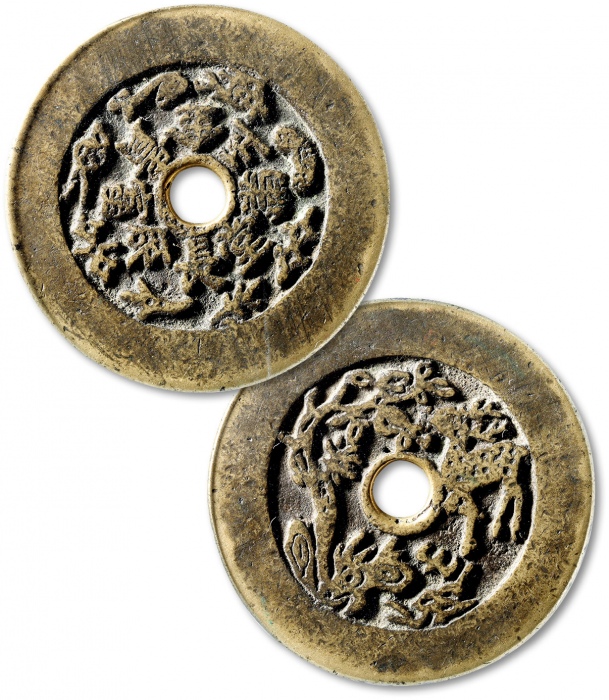 清“喜报三元”背“动物花卉吉祥纹”花钱一枚,直径:53.6mm,文字图案十分清晰,包浆温润自然,开门见山,公博 美75(60044778)