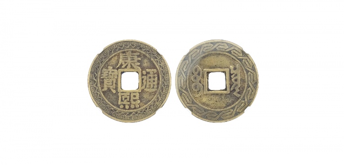 清康熙通宝宝泉罗汉刻花,公博评级 美85,2.69*0.13cm 5.2g