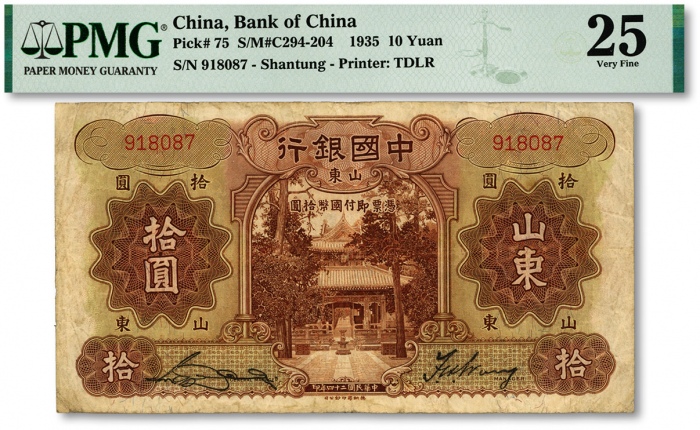 民国二十四年(1935年)中国银行国币拾圆,山东地名,无字轨,宋汉章·王祖训签名,色彩浓郁,原汁原味,海外资深藏家出品,七五成新