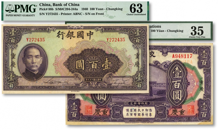 民国纸币共2种,详分:1914年交通银行壹百圆,重庆地名;1940年中国银行壹百圆,重庆地名;均为单字轨,色彩浓郁,原汁原味,海外资深藏家出品,八至九八成新