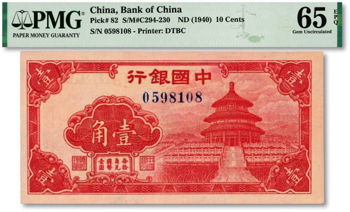 中国银行(1940年)红天坛图壹角,纸张硬挺,色彩浓艳,原汁原味,海外资深藏家出品,全新(季军分)