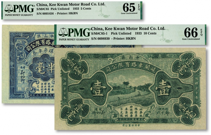 民国二十二年(1933年)中山县岐关车路有限公司半毫、壹毫共2枚,香港钞票公司雕刻版印制,海外资深藏家出品,全新