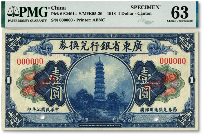 民国七年(1918年)广东省银行兑换券壹圆样本券,纸张纹路清晰,色彩浓郁纯正,原汁原味,海外资深藏家出品,九八成新