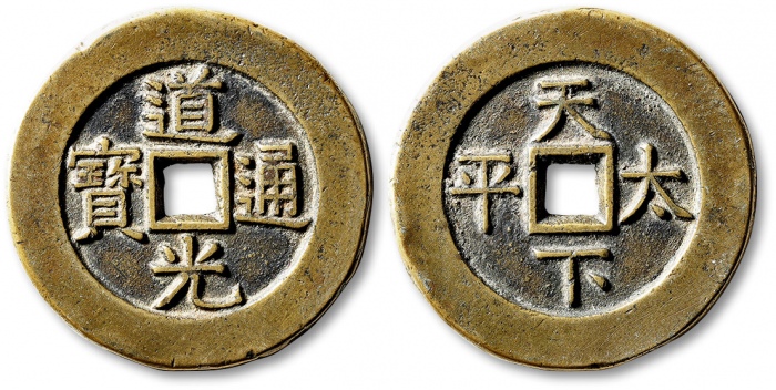 清“道光通宝”背“天下太平”大钱一枚,直径:38mm,钱体厚重,字口立体挺拔,地章平整,包浆醇正,极美品