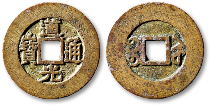 清“道光通宝”阿克苏局部颁样钱一枚,直径:27.3mm,此钱铸造极为精美,铜质精良,笔画清晰爽利,工艺一流,包浆温润熟美,品相难得,极少见,极美品