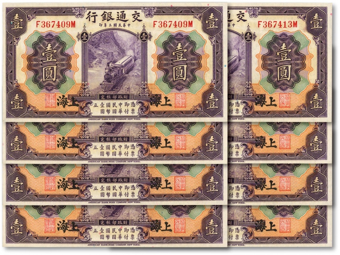 民国三年(1914年)交通银行紫色壹圆共8枚连号,纸张硬挺,纹路清晰,凹凸明显,色彩纯正明艳,原汁原味,沪上前辈藏家出品,近九成新
