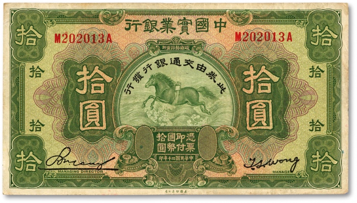 民国二十年(1931年)中国实业银行改交通银行拾圆,色彩浓郁,原汁原味,沪上藏家旧藏,八成新