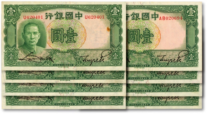 民国二十五年(1936年)中国银行德纳罗版壹圆共8枚,背印“帆船壹圆银币”图,含单字轨5枚、AA字轨1枚、AB字轨2枚,纸张硬挺,纹路清晰,凹凸明显,色彩纯正明艳,原汁原味,沪上前辈藏家出品,九八至全