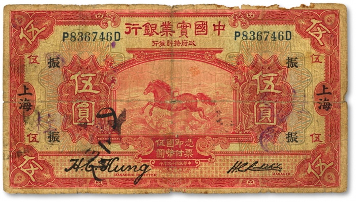 民国十三年(1924年)中国实业银行伍圆,上海地名,加印领券“振”字,沪上老藏家旧藏,原票七成新