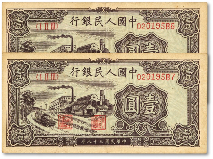 第一版人民币“工厂图”壹圆共2枚连号,色彩浓郁,图案线条清晰,纸张硬挺,凹凸明显,原汁原味,状态上佳,沪上前辈藏家出品,九成新