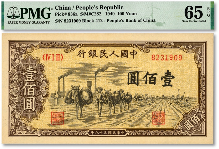第一版人民币“驮运”壹佰圆,H版,少见版式,据统计目前仅占此品种之13.7%,纸张硬挺,凹凸明显,色彩浓艳鲜明,海外藏家出品,全新(季军分,由于评级公司未细分版式,或为此H版之冠军分)