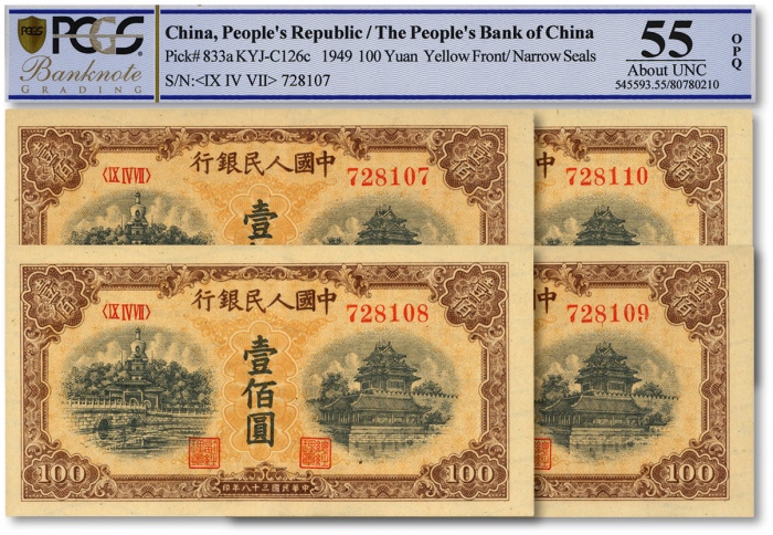 第一版人民币“黄北海桥”壹佰圆共4枚连号,印章窄距,横波纹水印,纸张硬挺,纹理清晰,色彩浓艳鲜明,原汁原味,海外藏家出品,九五成新