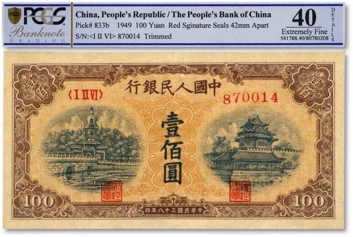 第一版人民币“黄北海桥”壹佰圆,印章宽距,横波纹水印,纸张硬挺,凹凸明显,色彩浓艳鲜明,原汁原味,海外藏家出品,八五成新(严重低评,敬请观阅实物)