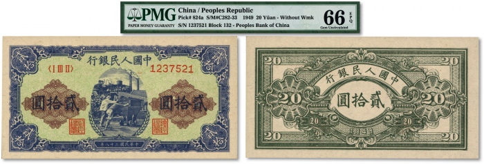 第一版人民币“推煤车”贰拾圆,纸张硬挺,纹路十分清晰,色彩浓郁纯正,顶级品相,十分难得,资深藏家出品,全新(为数寥寥之亚军分,冠军分仅1枚)