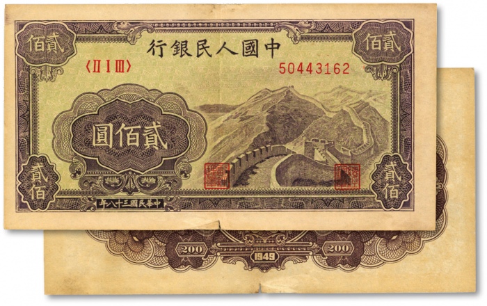 第一版人民币“长城图”贰佰圆,色彩浓郁,图案线条清晰,纸张硬挺,凹凸明显,原汁原味,状态上佳,沪上前辈藏家出品,近九成新