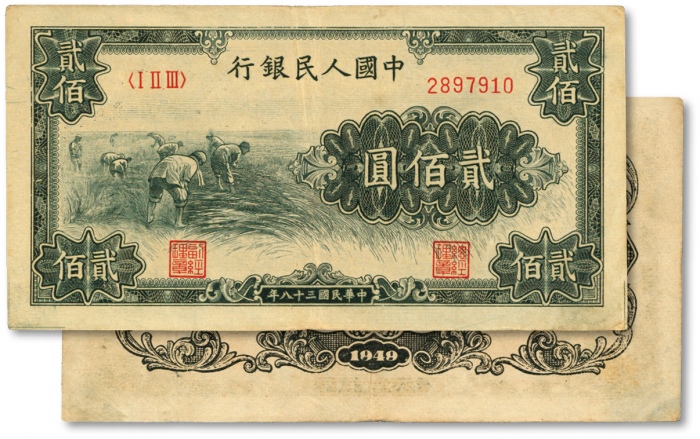 第一版人民币“割稻”贰佰圆,色彩浓郁,图案线条清晰,纸张硬挺,凹凸明显,原汁原味,状态上佳,沪上前辈藏家出品,九成新