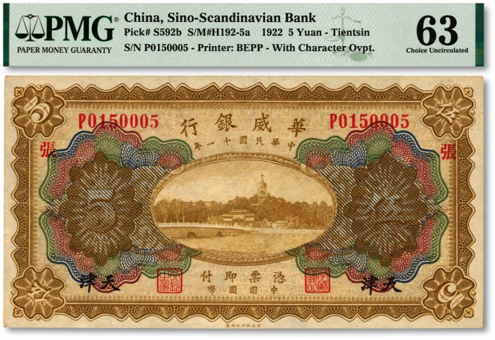 民国十一年(1922年)华威银行多色版伍圆,天津地名,加印领券“张”字,背为第二版签名,色彩纯正,海资深藏家旧藏,九八成新(季军分)
