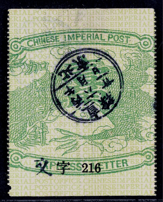 清第三次快信邮票龙身壹角旧票一枚,交字216号,正盖直隶北京丙午六月廿一日双圈小三格干支日戳,背盖江苏上海六月廿七日同款式干支到达戳,上中品