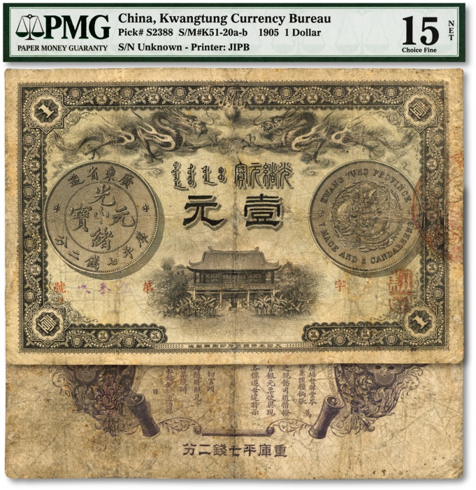 光绪三十一年(1905年)广东官银钱局壹元,上印“广东省造光绪元宝库平七钱二分”银币图,背印“两广总督岑春煊”及“广东巡抚张人骏”之告示,图案清晰,海外资深藏家出品,有修补,七成新