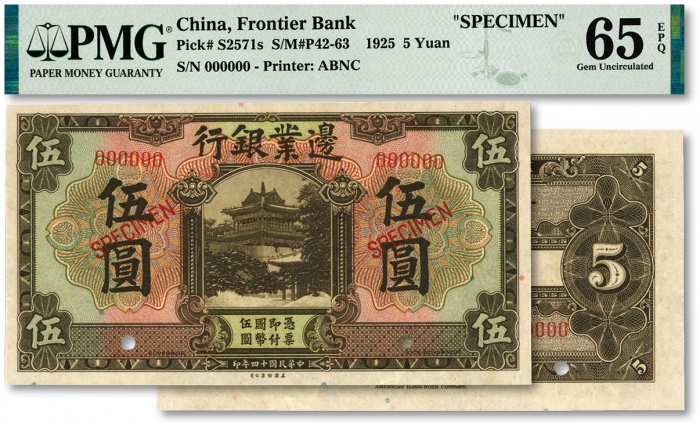 民国十四年(1925年)边业银行美钞版伍圆样本券,纸张硬挺,纹理清晰,色彩浓郁醇正,品相上佳,九八成新(季军分)